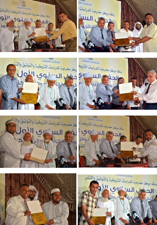 وفي ختام الحفل كرم مدير مكتب الثقافة بالساحل ومدير المركز عبدالله الجعيدي والدكتور خالد بلخشر والحبيب جعفر ال سقاف الشيخ علي بن سالم بكير بتكريم رئيس جامعة حضرموت بدرع التعاون المشترك مع المركز وكذا نادي متطوعون بدرع الشراكة وتكريم الفائزين بالمركز الثاني الإعلامي المذيع أيمن عمر باظروس نيابة عن طاقم فريقه بمسابقة الفيلم التسجيلي الوثائقي وحصول فيلمه بعنوان ” صناعة النورة” من إعداده وتقديمه وتصوير وإخراج طلال باحيدرة بعد أن حجب المركز الأول من قبل لجنة التحكيم فيما منحت الجائزة الثالثة مناصفة ومشاركة في مجال البحث التاريخي ” إحلال السلام في حضرموت ” للباحثين الدكتور أحمد هادي باحارثة ومحمد سالم باحمدان بعد حجب جائزة المركزين الأولى والثانية.