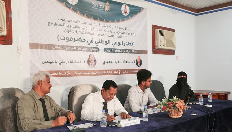 أقيمت محاضرة بعنوان (تطور الوعي الوطني في حضرموت) في كلية التربية بجامعة حضرموت بحضور عدد من الأكاديميين والباحثين والطلاب وعدد من الحضور من خارج الجامعة حيث افتتحت المحاضرة بكلمة ترحيبية ألقاها عميد كلية التربية د. سعيد سالمين بلعفير مرحباً بالمركز والحضور ومؤملاً في استمرار هذه المناشط من محاضرات وندوات لما لها من أثر إيجابي على الطلاب، وأيضاً ألقى أ.أحمد العطاس مدير عام صندوق التراث والتنمية الثقافية كلمة أعرب فيها عن مدى اهتمام الصندوق بالنشاطات الثقافية والحاجة الملحة للكثير من المحاضرات الثقافية، واشتملت المحاضرة على محورين أساسين (المنظور التاريخي، والمنظور الثقافي).