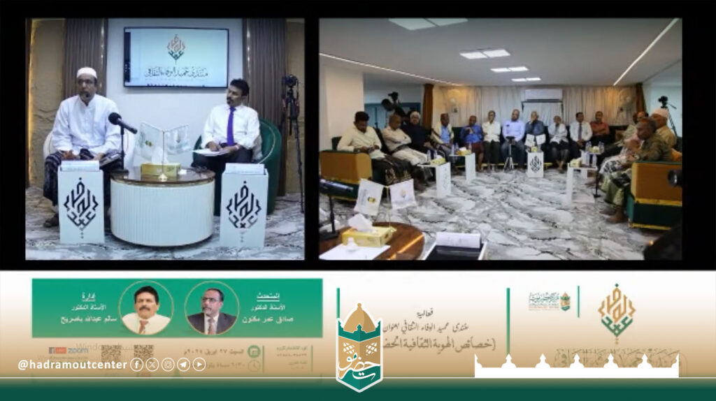 أقام منتدى عميد الوفاء الثقافي التابع لمركز حضرموت للدراسات التاريخية والتوثيق والنشر امس بتاريخ ٢٠٢٤/٤/٢٧م فعاليته الثانية ( خصائص الهوية الثقافية الحضرمية ) حاضر فيها : أ.د صادق عمر مكنون وأدارها أ.د سالم عبدالله باصريح بحضور مدير عام الثقافة أ.عبير محمد الحضرمي وعدد من الأساتذة والمثقفين والشباب، وبثت المحاضرة مباشرة على الشبكة العنكبوتية “ZOOM ” و you tube.